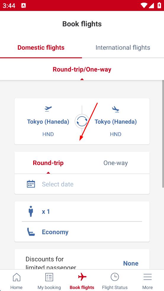 3、登录成功后,点击“Book flights”选项,进入航班预订页面,在该页面选择“Domestic flights”,设置往返或单程、出发地、目的地、日期等信息,即可进行国内航班预订操作。