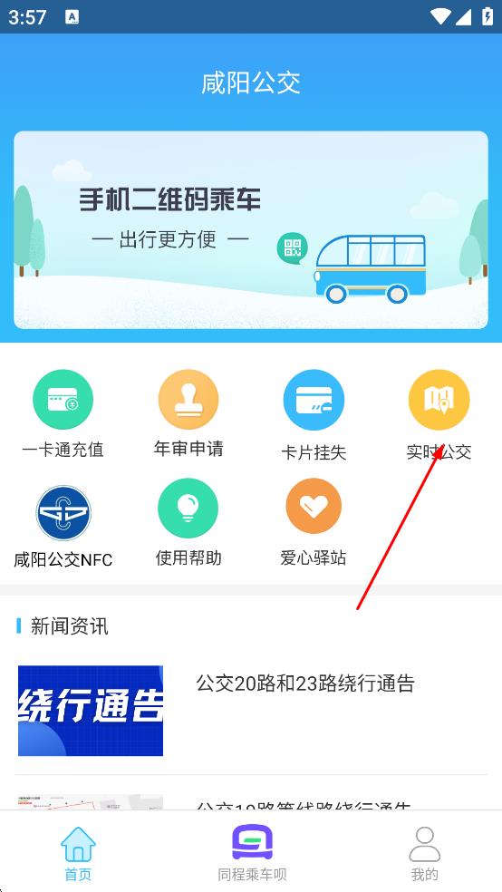 1、打开咸阳公交APP,在首页点击“实时公交”选项,进入实时公交查询页面。
