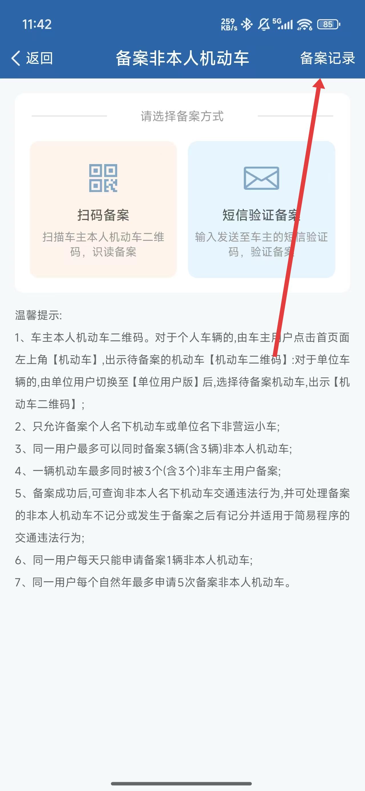 2、在进入到备案非本人机动车页面后,可以点击右上角的备案记录按钮,查看备案信息。