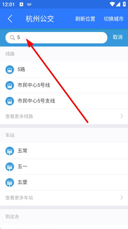 3、在搜索栏中输入想要查询的公交路线编号,如5路。