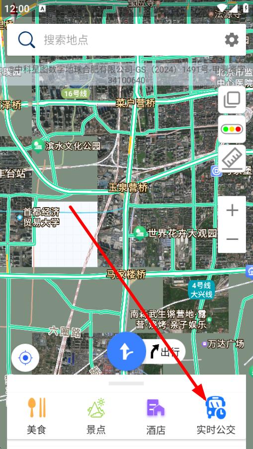 1、打开北斗导航应用,在主界面下方点击实时公交图标。