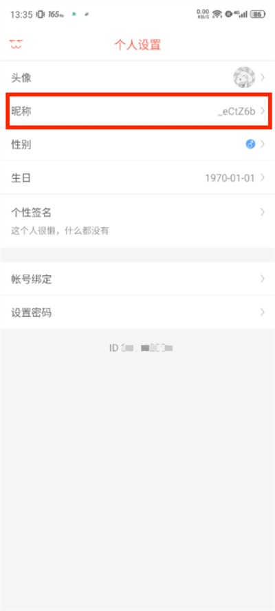 4、点击后进入个人设置界面,在这里即可看到昵称选项,点击一下;
