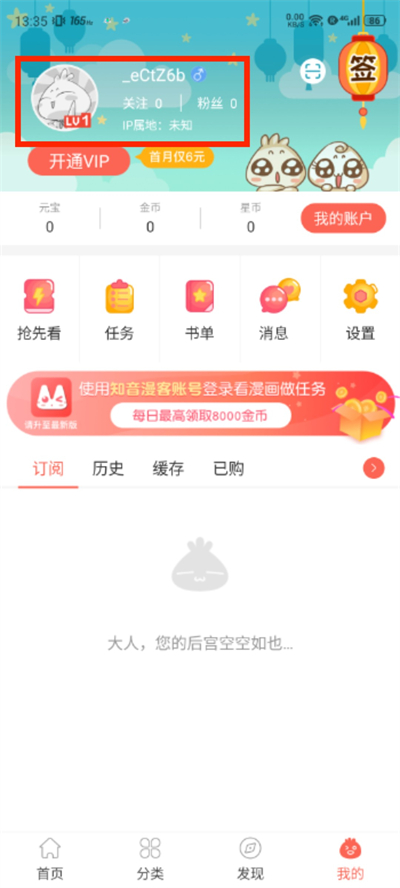 1、首先打开下载好的知音漫客app,进入软件后点击界面右下角【我的】选项;