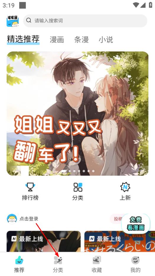 1、打开屯屯漫画,点击页面底部的分类,进入分类页面。