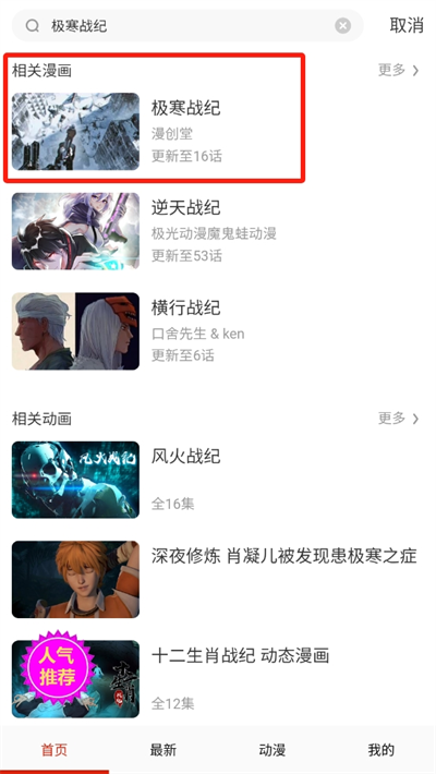 2、在搜索出我们以极寒战纪为例进行找寻,在搜索的过程中还能看到有关热门搜索内容;