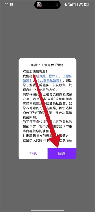 1、打开咚漫漫画APP,在弹窗中点击同意,进入应用首页。