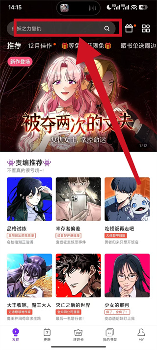 3、在搜索界面里输入目标名字,点击对应的漫画,进入该漫画的详情页面。