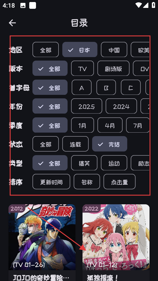 2、在目录页面,筛选条件找到想看的动漫,进入该剧集页面。