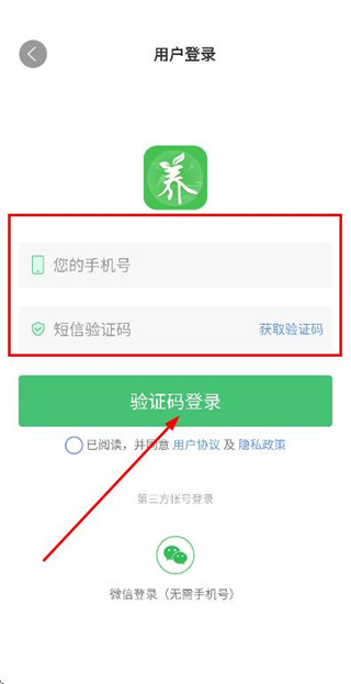 3、在登录页面填写手机号和验证码,勾选协议后,点击验证码登录完成登录操作。