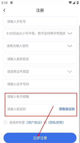 5、填写电子邮箱,并输入收到的验证码,点击立即注册完成账号注册。