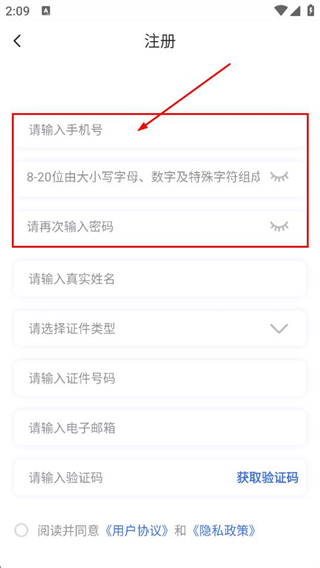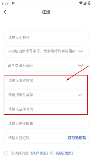 4、在注册页面,填写真实姓名,选择证件类型并输入对应的证件号码。