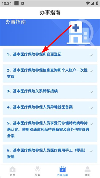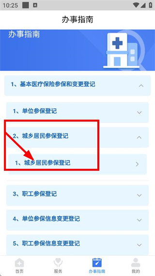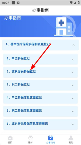 4、在子选项页面,点击城乡居民参保登记,进入办事指南详情页面。