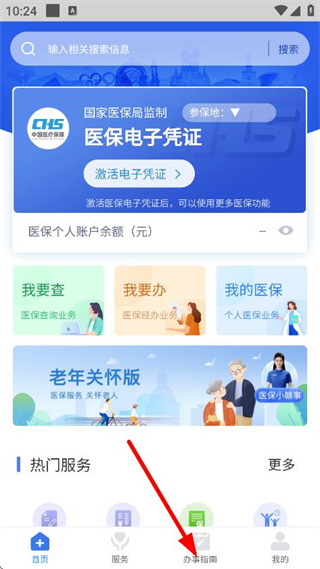 1、在江西医保的首页,点击底部办事指南,进入办事指南页面。