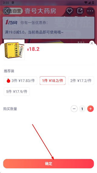 4、在弹出的确认购买数量页面,选择或确认购买数量,点击确定。