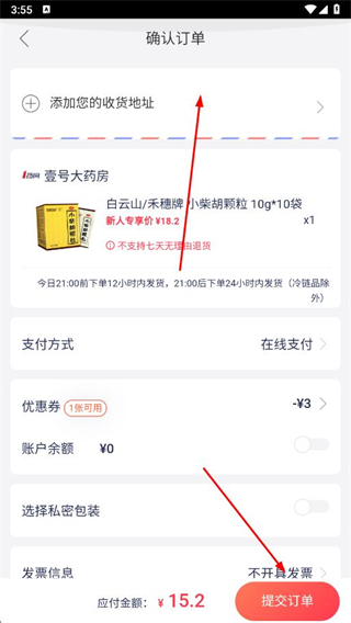 5、在确认订单页面,添加收货地址,点击提交订单,完成买药操作。