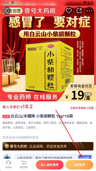 3、在药品详情页,查看药品信息后,点击立即购买。