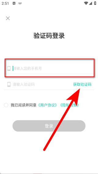 3、在登录页面,输入手机号,点击获取验证码。