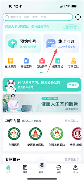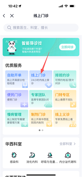 1、在华医通首页,点击线上问诊选项,进入线上门诊页面。