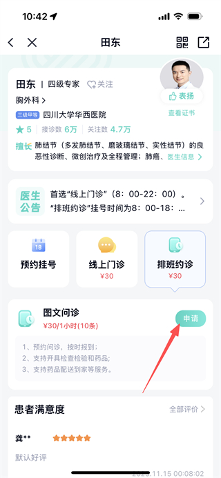 4、在医生详情页面,点击申请按钮,可发起图文问诊。