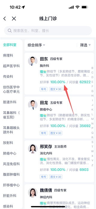 2、在线上门诊页面,点击线上门诊选项,进入医生列表页面。