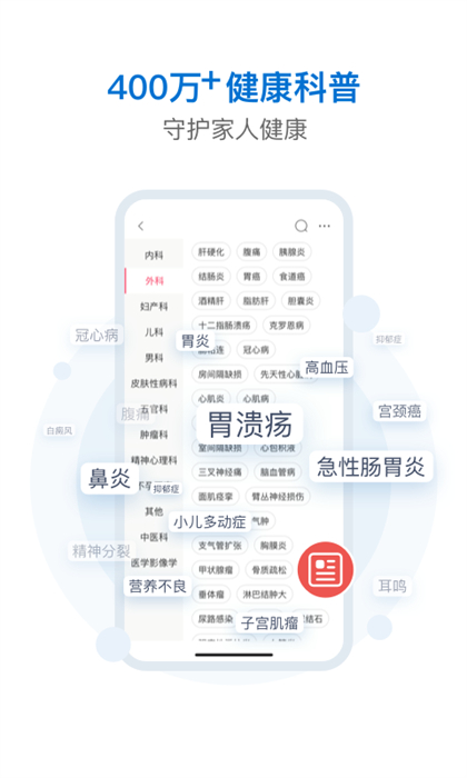 用户通过搜索疾病或症状相关的词找到对应的科普内容、医院和医生。