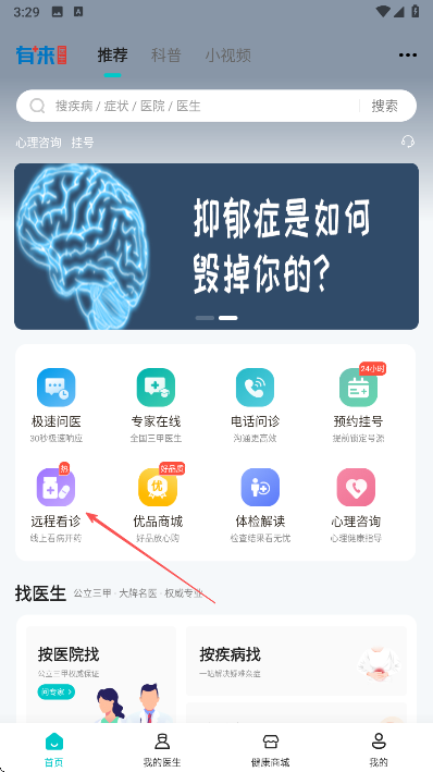2、在首页界面中,找到并点击远程看诊图标,进入远程看诊页面。