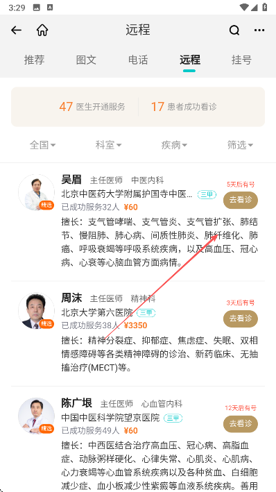 3、在远程看诊页面,浏览医生列表,选择合适的医生,点击医生右侧的去看诊按钮。