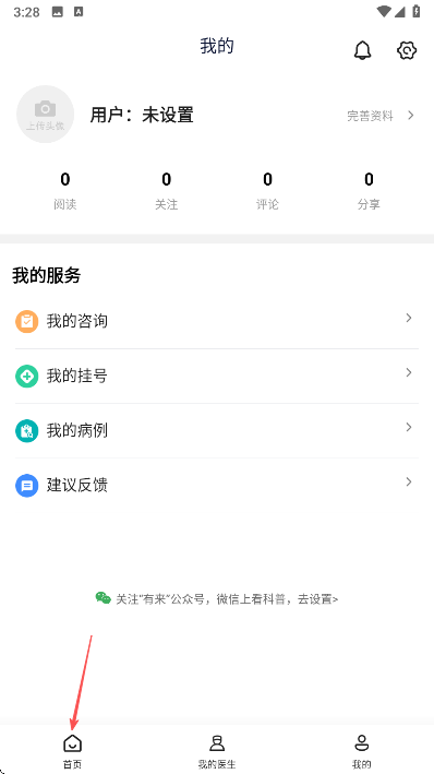 1、打开有来医生APP,在底部菜单栏点击首页,进入首页界面。
