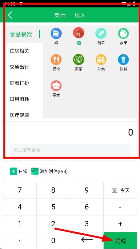 4、选择支出和收入分类,填写金额,可添加备注、附件,最后点击完成,即可记录账单。