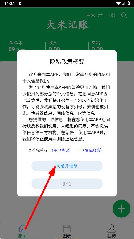 1、打开APP,在弹出的隐私政策概要页面点击同意并继续。