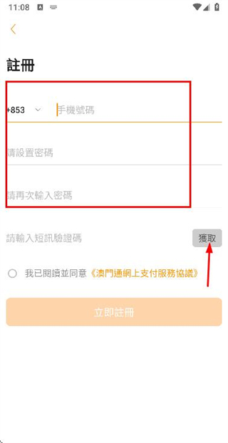 2、在注册账号页面填写手机号码和密码后,点击获取得到短信验证码。