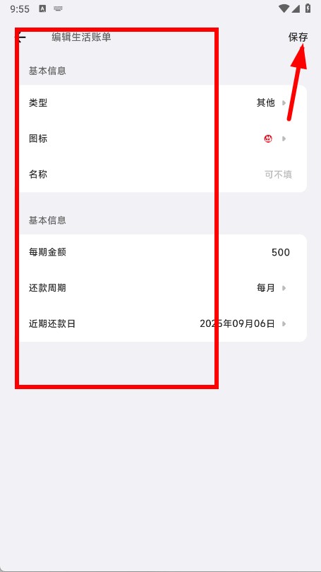 4、填写类型、名称、近期还款日等信息后,点击右上角的保存,完成生活账单的添加。