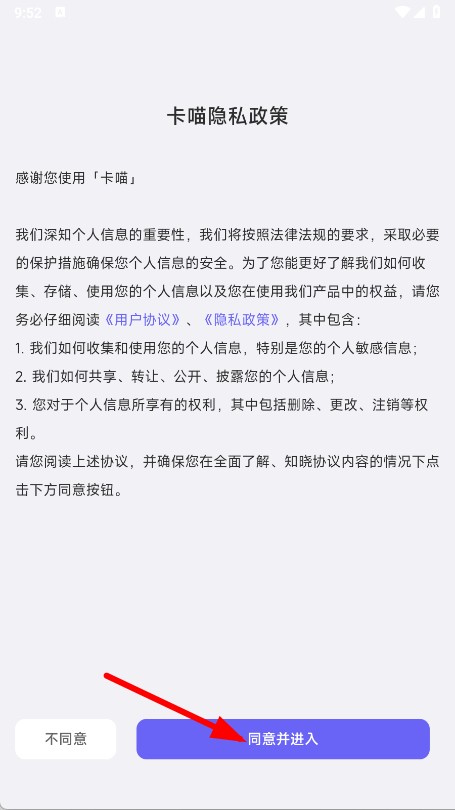 1、打开卡喵APP,在弹出的隐私政策页面点击同意并进入。