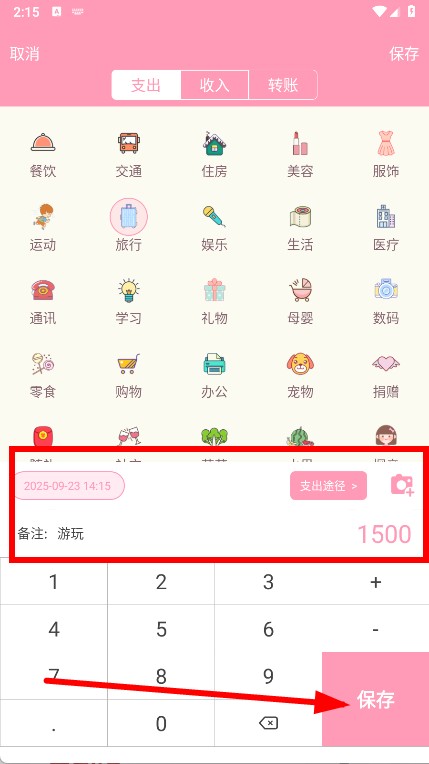 1、萌系界面提升记账兴趣:整体采用粉色系配色搭配可爱表情符号和卡通元素,将收支记录转换为充满少女心的视觉呈现,即使是记账新手也能享受记录过程。