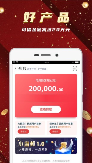 小店邦是一款便捷好用的手机金融app,软件上给用户提供了非常实用的贷款功能,用户可以在这里进行贷款申请,审批速度快,审批完毕之后就能够急速放款,贷款的额度高达20万元,非常的使用。软件的各项金融产品都是经过了国家的认证的正规产品,利息的额度也不超过国家规定标准。