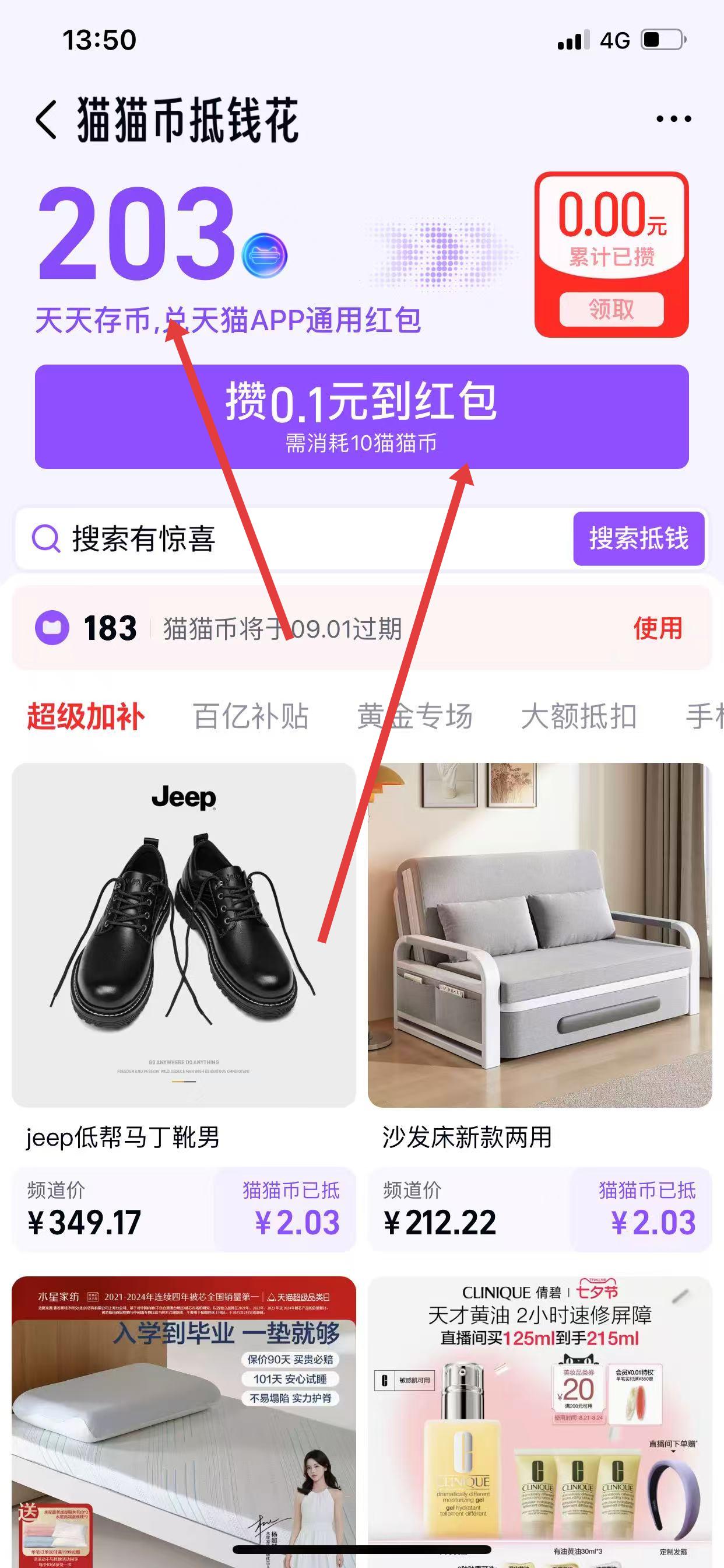 2、在猫猫币抵钱花页面,可查看拥有的猫猫币数量及抵现规则。