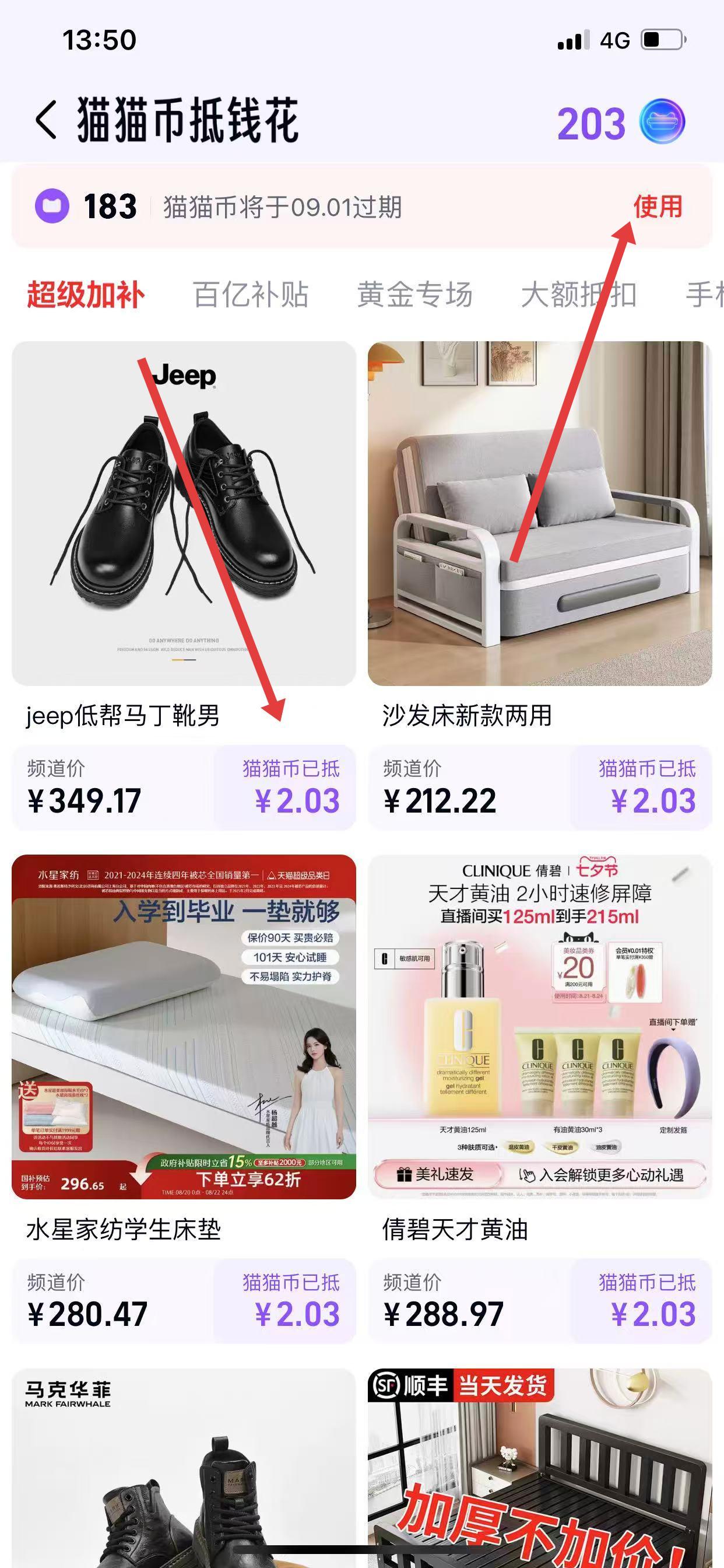 3、点击去使用,会跳出许多支持猫猫币抵现的商品,可进行下单。