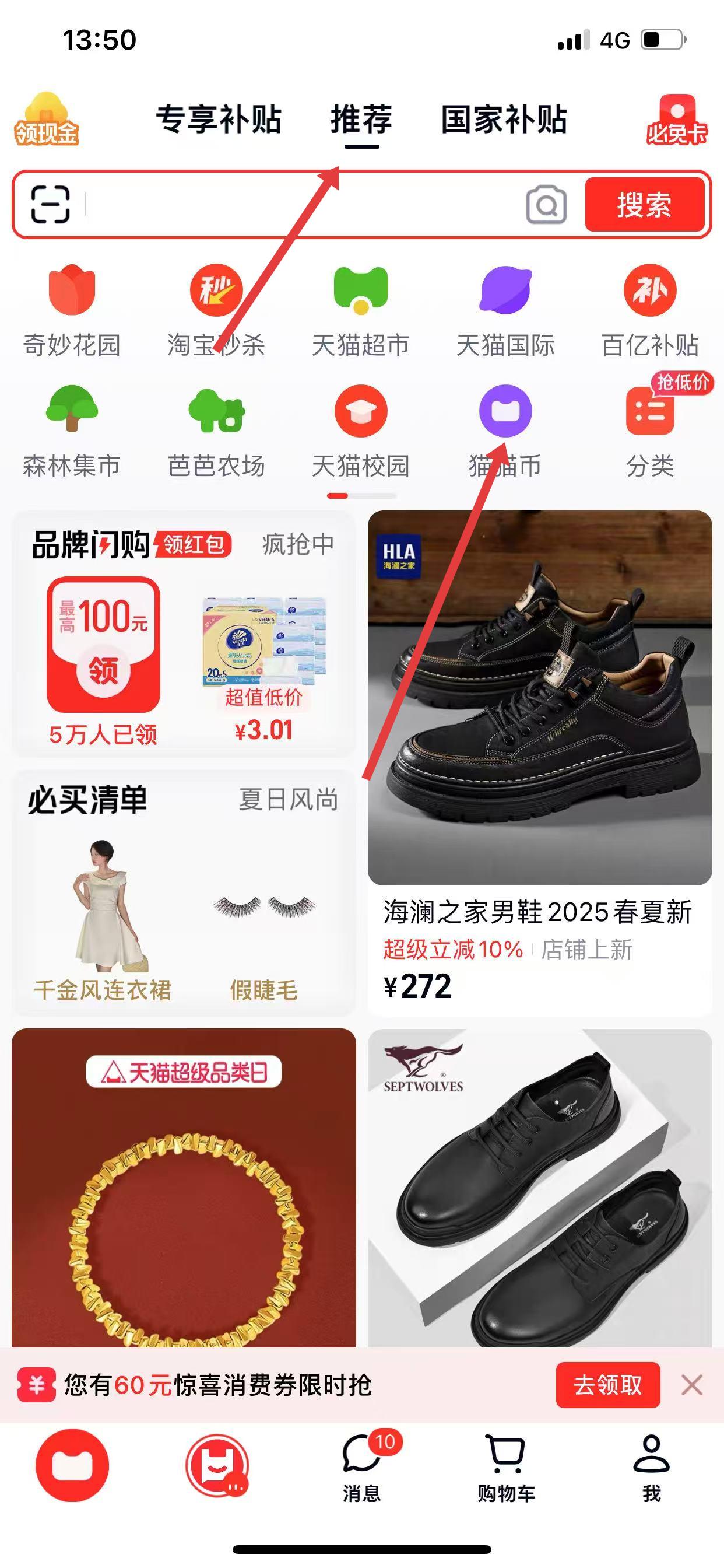 1、在首页推荐页面,点击猫猫币图标,进入猫猫币相关页面。