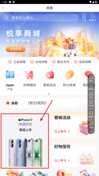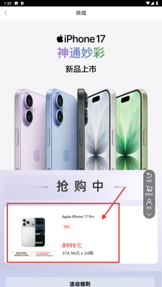 2、在商城页面,点击iPhone-17神通妙彩新品上市板块,进入苹果手机商品页。