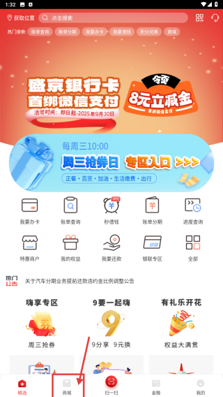 1、打开银行APP,点击底部商城选项,进入商城购物页面。