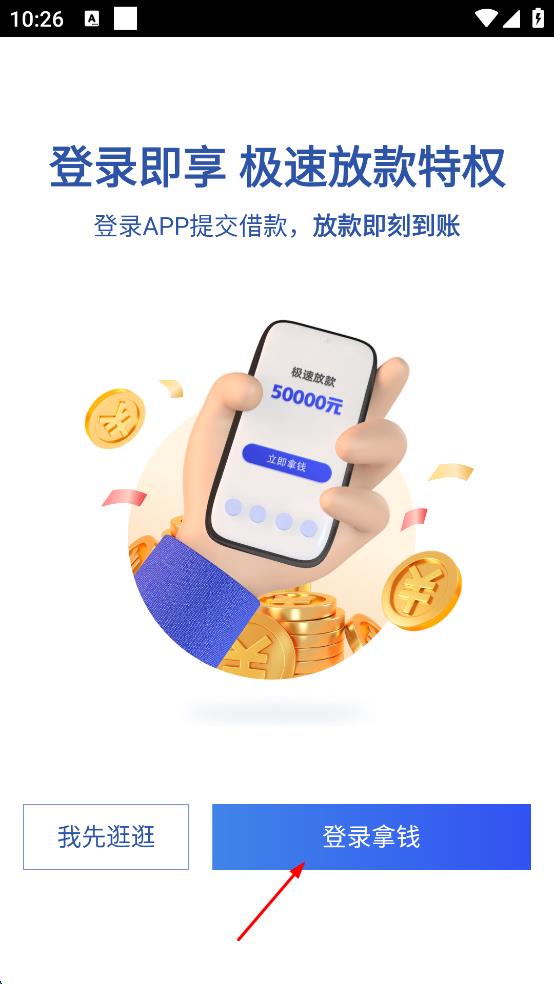 2、在新页面中,看到“登录即享极速放款特权”的提示,点击“登录拿钱”按钮,进入登录界面。