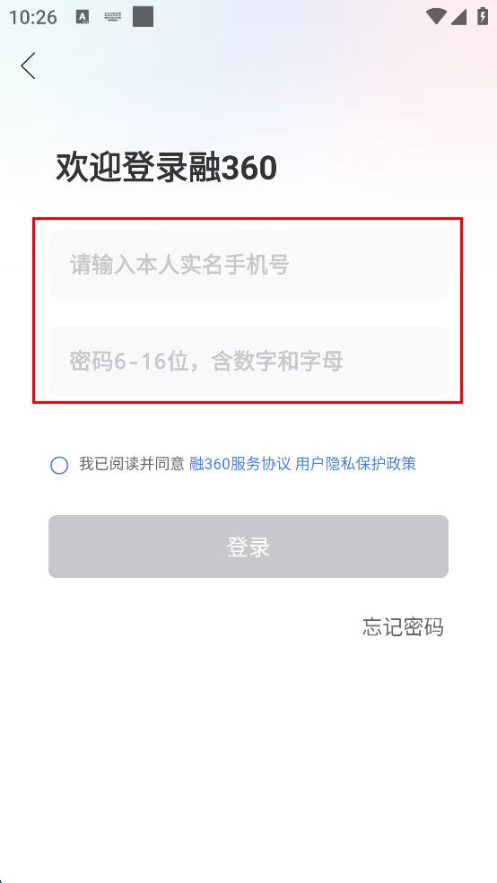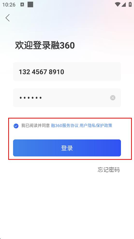 4、输入完成后,勾选“我已阅读并同意融360服务协议 用户隐私保护政策”选项,然后点击“登录”按钮,即可完成登录。