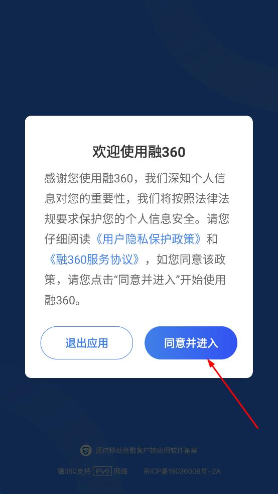 1、打开融360软件,进入欢迎使用界面,仔细阅读用户隐私保护政策和融360服务协议后,点击同意并进入按钮,进入下一个页面。
