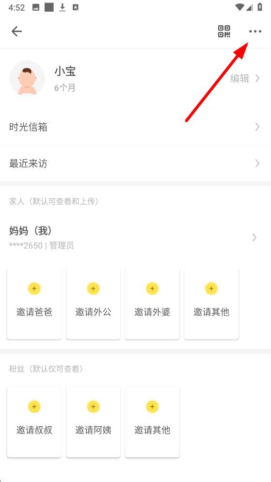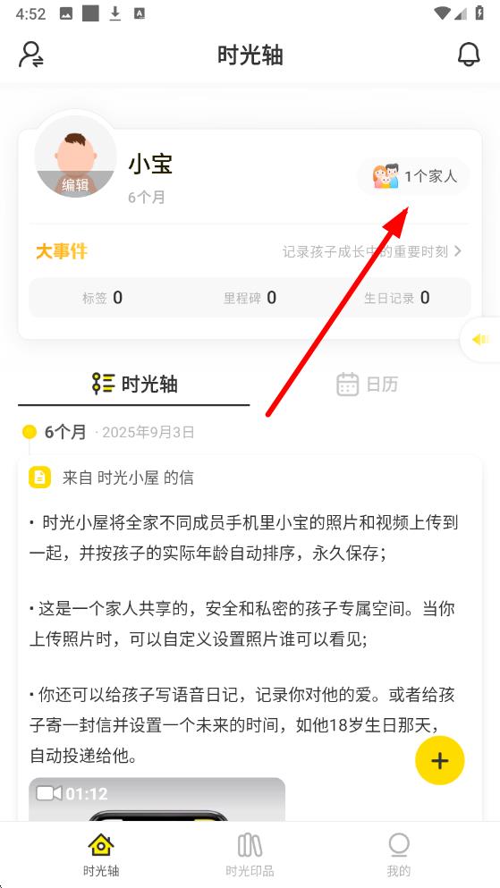1、进入时光轴界面后,点击孩子头像旁的图标进入个人中心。