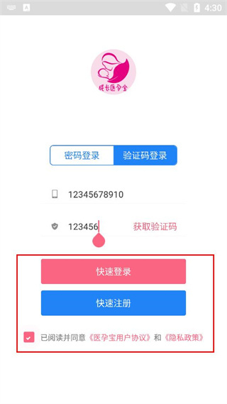 1、打开医孕宝成长孕育APP,查看弹出的用户协议和隐私政策提示,点击同意按钮进入应用。