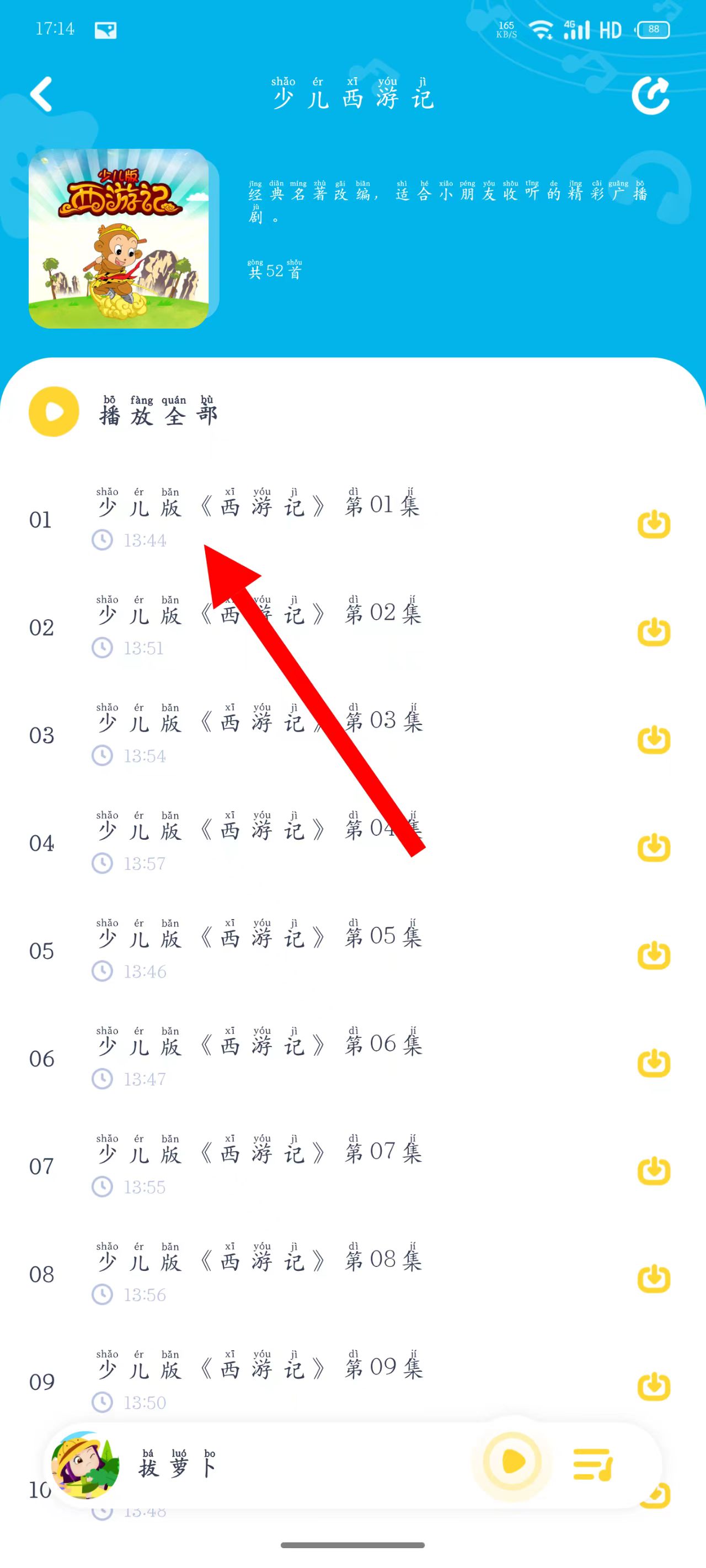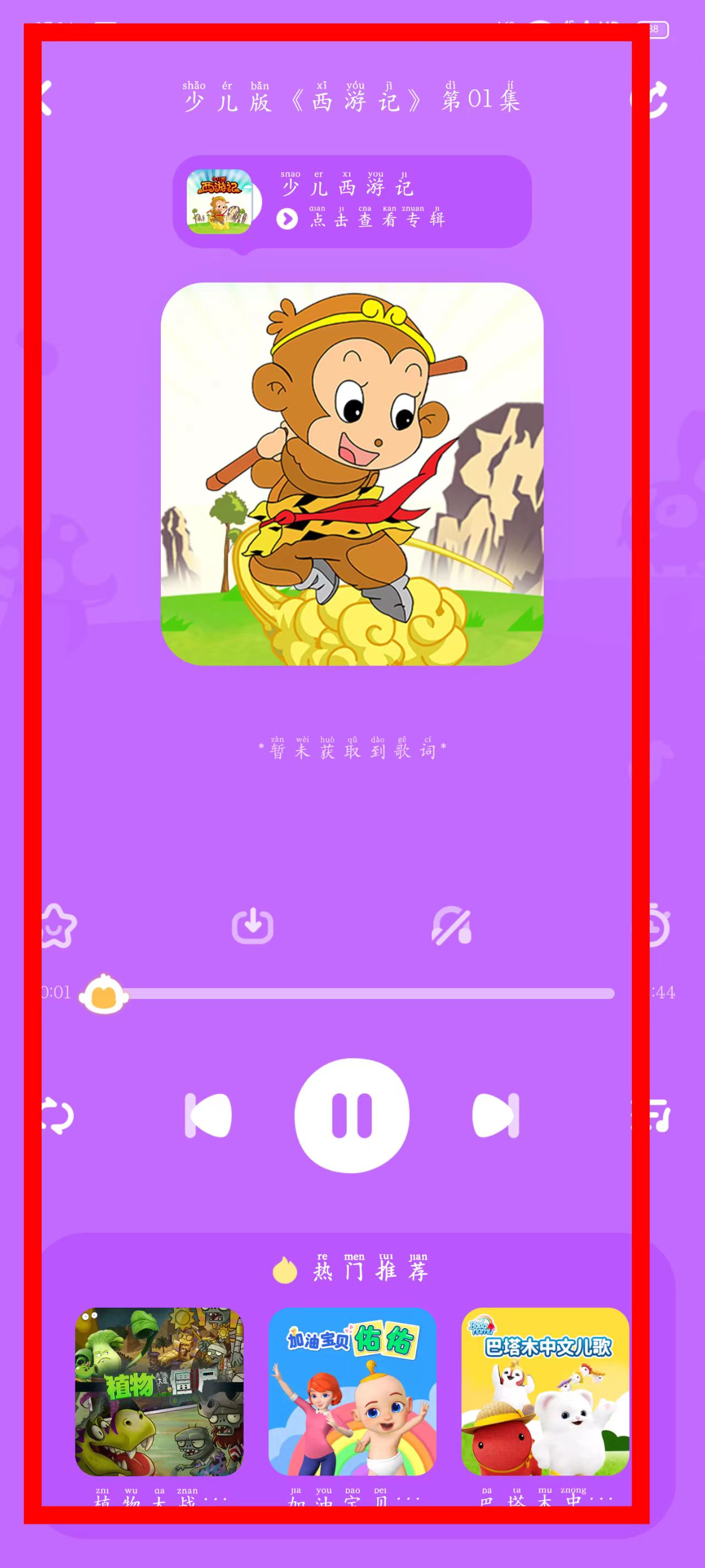 3、进入专辑页面后,点击少儿版第01集,即可进入播放页面。