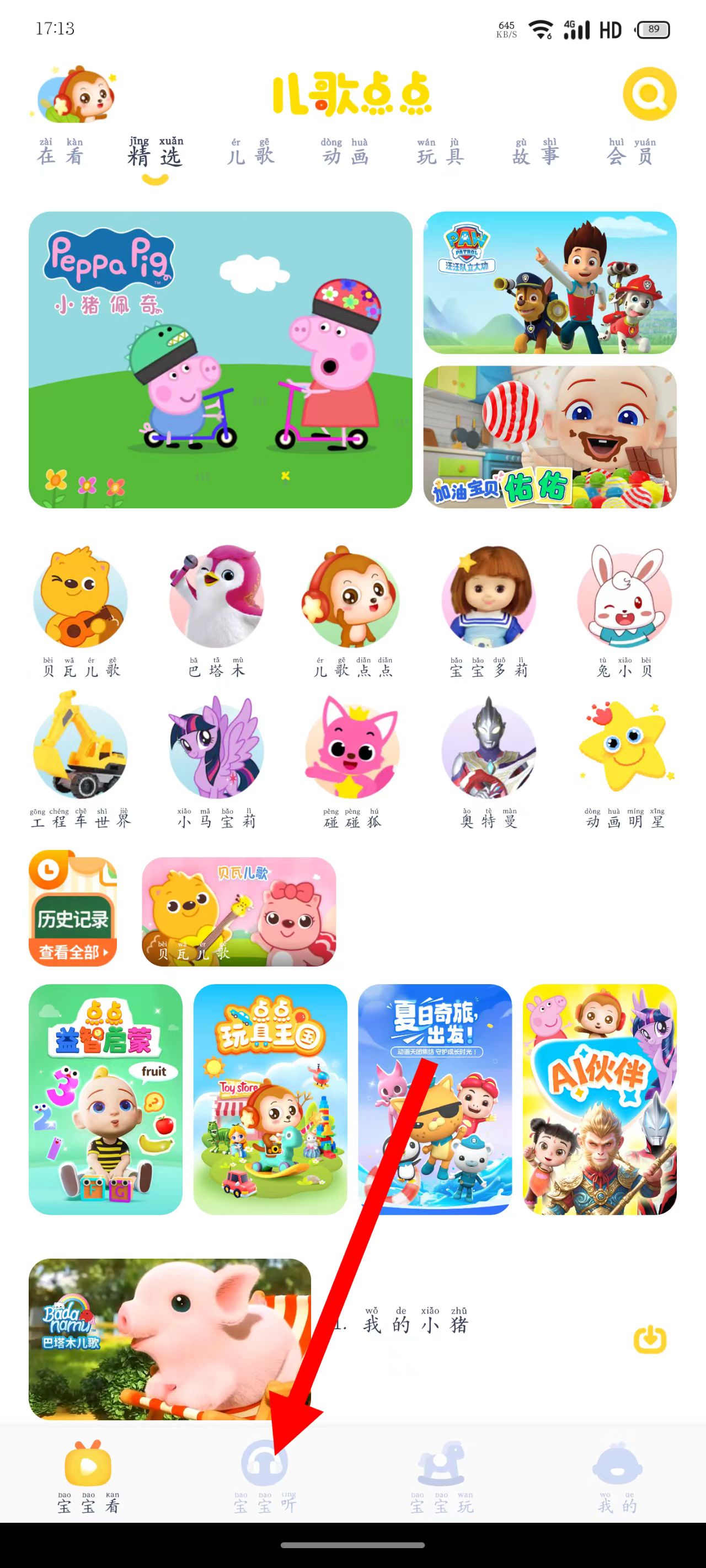 1、打开APP,进入主界面后,点击底部的宝宝听选项,进入音频内容页面。
