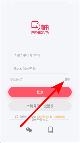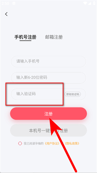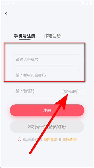 3、在手机号注册页面,输入手机号,设置6-20位密码,点击获取验证码。
