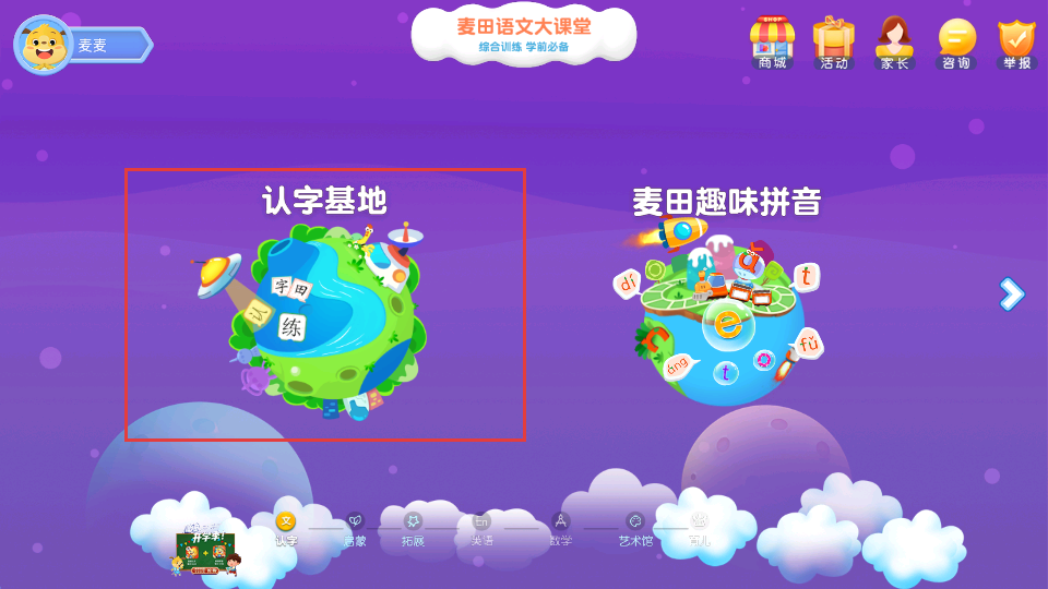 2、在麦田语文大课堂页面,点击认字基地,进入认字相关场景。