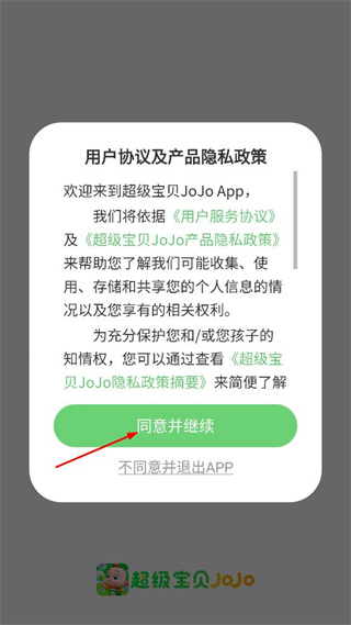 1、打开超级宝贝JoJoAPP,查看弹出的用户协议及产品隐私政策提示,点击同意并继续按钮进入应用。